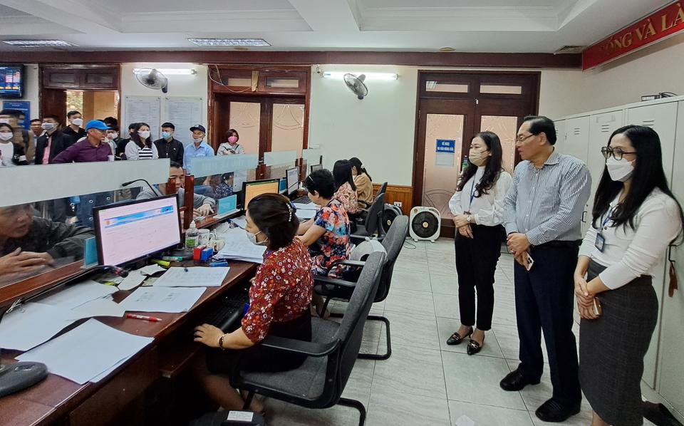 Kiểm tra thực tế việc tiếp nhận, giải quyết thủ tục hành chính tại bộ phận ''một cửa'' thuộc Sở Tư pháp Hà Nội trong ngày 7/4. Ảnh: KTĐT
