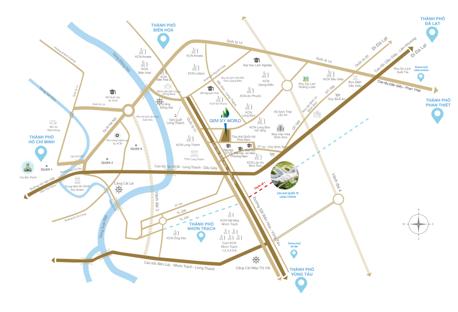 Nằm trên trục đường quốc lộ 51, xã Long Đức, huyện Long Thành, từ Gem Sky World, cư dân chỉ mất 5 phút là đến sân bay Long Thành, và chỉ khoảng 5-15 phút là tới các tuyến đường cao tốc Long Thành – Dầu Giây, Biên Hòa – Vũng Tàu, Bến Lức – Long Thành, Vành đai 3-TP.HCM,… Nhờ đó, không chỉ tạo điều kiện thuận lợi cho cư dân di chuyển liên tỉnh, liên vùng mà còn dễ dàng tiếp cận với quốc tế.