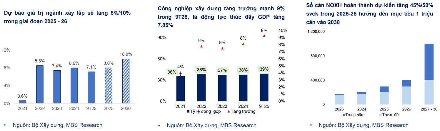 Theo báo cáo chiến lược 2026 của MBS Research, ngành xây dựng có thể ghi nhận mức tăng trưởng khoảng 8% trong năm 2025 và lên tới 10% trong năm 2026, trở thành một trong những ngành đóng góp quan trọng cho tăng trưởng GDP. Trong 9 tháng đầu năm 2025, công nghiệp xây dựng đã tăng khoảng 9% so với cùng kỳ, qua đó hỗ trợ GDP tăng gần 7,9%.