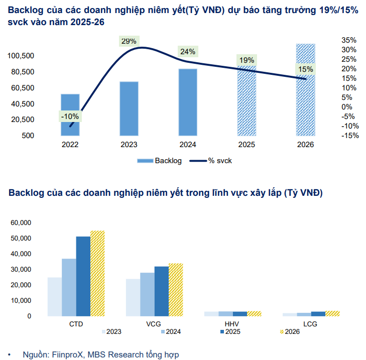 Trong bối cảnh nguồn việc gia tăng, backlog của các doanh nghiệp xây dựng niêm yết được MBS dự báo tăng trưởng lần lượt 19% trong năm 2025 và 15% trong năm 2026, chủ yếu đến từ các doanh nghiệp đầu ngành. Việc số lượng dự án được cấp phép mới tăng mạnh, cùng với sự cải thiện về sức khỏe tài chính của các chủ đầu tư bất động sản, giúp giảm rủi ro nợ xấu và chi phí trích lập dự phòng cho nhà thầu.