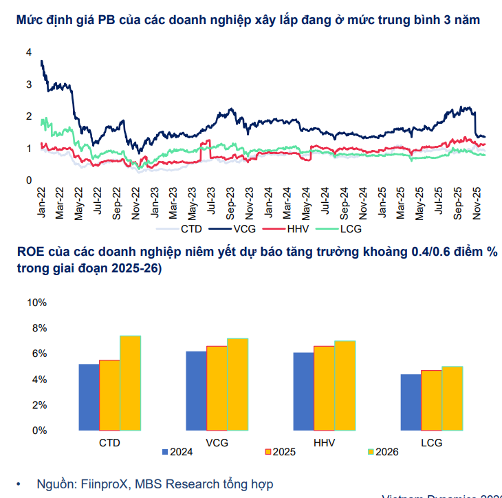 Từ góc độ đầu tư, MBS cho rằng triển vọng tăng trưởng của ngành xây dựng trong chu kỳ 2025–2026 là tương đối rõ nét, song mức độ hưởng lợi giữa các doanh nghiệp sẽ có sự phân hóa. Những doanh nghiệp có vị thế đầu ngành, năng lực thi công tốt và quan hệ chặt chẽ với các chủ đầu tư lớn được kỳ vọng sẽ hưởng lợi rõ ràng hơn so với mặt bằng chung.