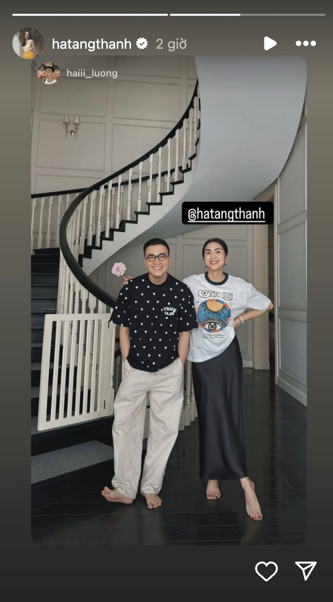 Mới đây, Lương Mạnh Hải đăng tải khoảnh khắc ghé chơi nhà Tăng Thanh Hà. Họ cùng nhau chụp ảnh trước góc check in quen thuộc trong biệt thự triệu đô của gia đình Hà Tăng. Ngay sau đó, Tăng Thanh Hà cũng nhanh chóng chia sẻ lại bài viết của "người tình màn ảnh" một thời.