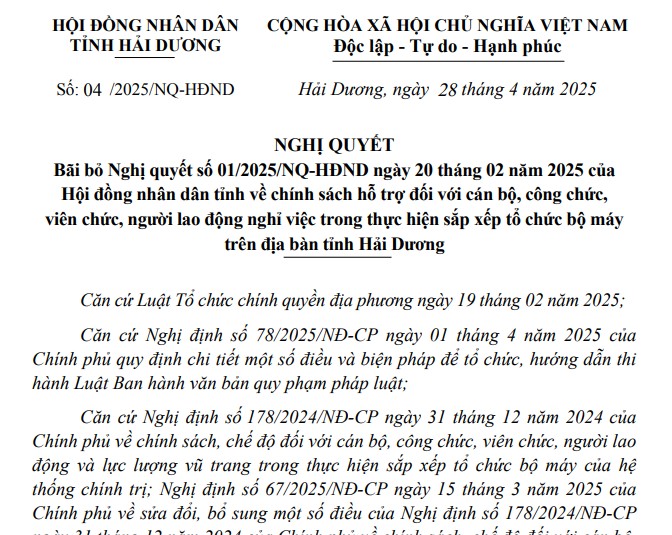 Ngày 28/4/2025, Hội đồng Nhân dân (HĐND) tỉnh Hải Dương đã ban hành Nghị quyết số 04/2025/NQ-HĐND, chính thức bãi bỏ toàn bộ Nghị quyết số 01/2025/NQ-HĐND ban hành ngày 20/2/2025 về chính sách hỗ trợ đối với cán bộ, công chức, viên chức và người lao động nghỉ việc trong quá trình sắp xếp tổ chức bộ máy trên địa bàn tỉnh.