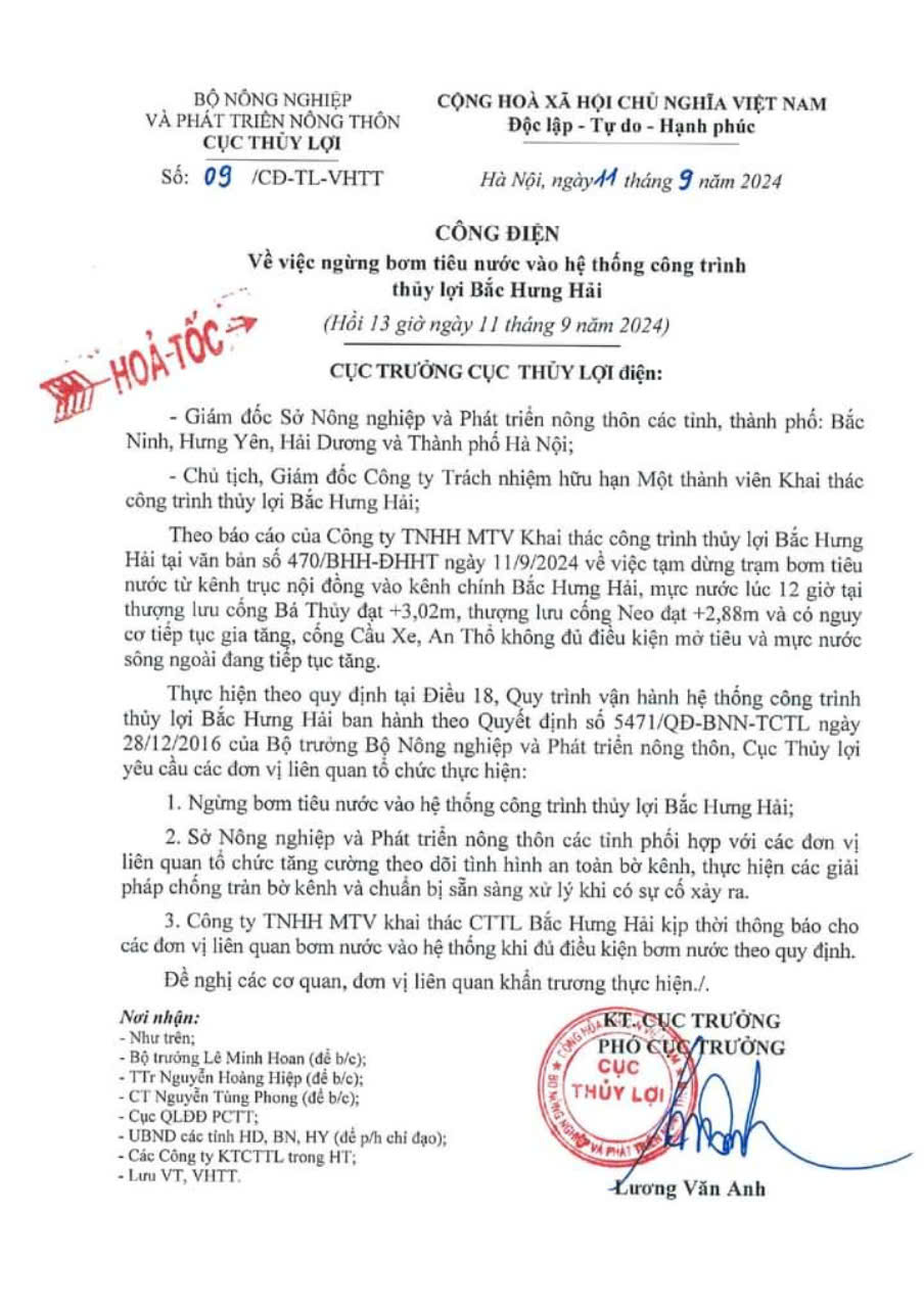 Do mưa lớn, địa phương vận hành các công trình tiêu nước ra kênh trục chính làm mực nước trên kênh trục chính Bắc Hưng Hải dâng lên rất cao. Tính đến 10h ngày 11/9, mực nước tại các điểm chốt đều vượt thiết kế tiêu.