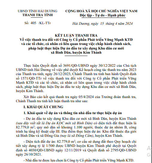 Thanh tra tỉnh Hải Dương vừa công bố kết luận thanh tra đối với Công ty Cổ phần Phát triển Vững Mạnh KTĐ và các tổ chức, cá nhân có liên quan trong việc chấp hành chính sách, pháp luật thực hiện Dự án đầu tư xây dựng Khu dân cư mới xã Bình Dân, huyện Kim Thành (Hải Dương).