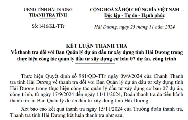 Thanh tra tỉnh Hải Dương vừa ban hành Kết luận thanh tra số 1417/KL-TTr ngày 25/11/2024 về việc thanh tra đối với Ban Quản lý dự án (BQLDA) đầu tư xây dựng tỉnh Hải Dương trong thực hiện công tác quản lý đầu tư xây dựng cơ bản 07 dự án, công trình. Các dự án bao gồm : Dự án Đầu tư xây dựng đường tỉnh 394B (đoạn từ Quốc lộ 5 đến cầu qua sông Sặt); Dự án Xử lý cấp bách các công trình đê điều thuộc địa bàn các huyện: Kim Thành, Nam Sách, Thanh Hà, Tứ Kỳ, Ninh Giang, thành phố Chí Linh và thành phố Hải Dương; Dự án Đầu tư xây dựng Nhà lớp học 3 tầng 15 phòng - trường THPT Ninh Giang; Dự án Trường THPT Nhị Chiểu, thị xã Kinh Môn (địa điểm mới - GĐ 2); Dự án Xây dựng mới nhà điều trị tâm căn và người bệnh cao tuổi, bệnh viện tâm thần Hải Dương; Dự án Nâng tầng 3, 4 nhà lớp học 2 tầng 6 phòng (móng 4 tầng), xây mới nhà lớp học 4 tầng 8 phòng, lợp mái tôn nhà lớp học bộ môn 4 tầng, phá dỡ nhà lớp học bộ môn cũ 3 tầng trường THPT Kinh Môn, thị xã Kinh Môn; Dự án Sửa chữa, nâng cấp, bổ sung trang thiết bị cho cơ sở cai nghiện ma tuý tỉnh Hải Dương.