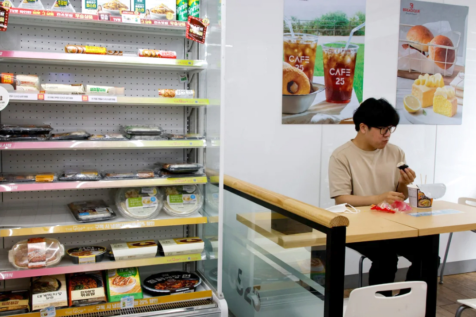 Cửa hàng tiện lợi không chỉ là địa điểm mua sắm, đây còn cung cấp rất nhiều dịch vụ ăn uống, rút tiền, thậm chí còn có điểm sạc pin xe điện. Hình ảnh nhân viên văn phòng ăn trưa tại một cửa hàng tiện lợi ở Seoul, Hàn Quốc. Ảnh: Reuters