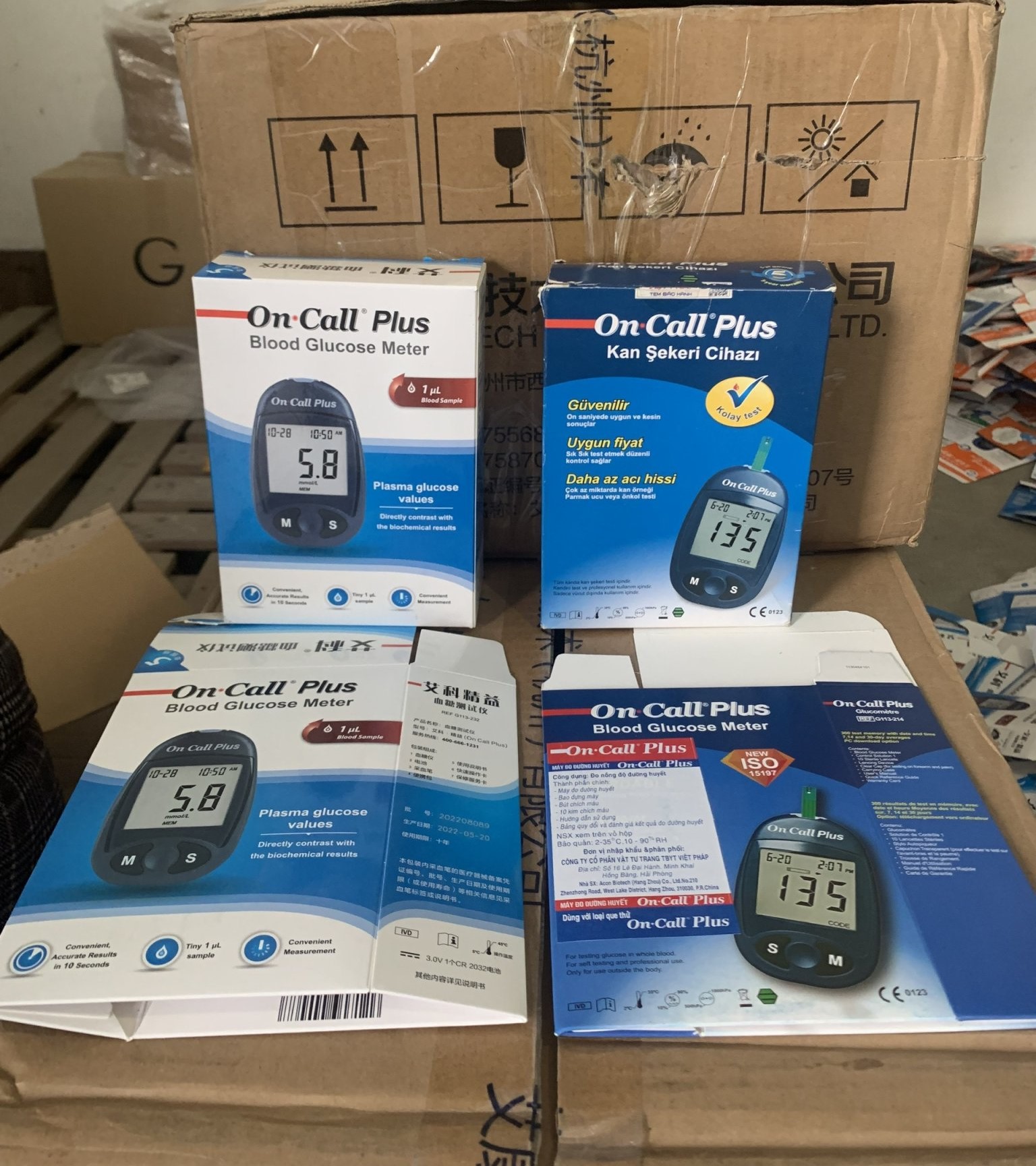 Kết quả kiểm tra lực lượng chức năng phát hiện 200 máy đo đường huyết mang nhãn hiệu On Call EZ IV; 197 máy đo đường huyết mang nhãn hiệu On Call Plus, tài liệu hướng dẫn sử dụng On Call EZ IV, thẻ quy định bảo hành, bảng quy đổi và đánh giá kết quả đo đường huyết.