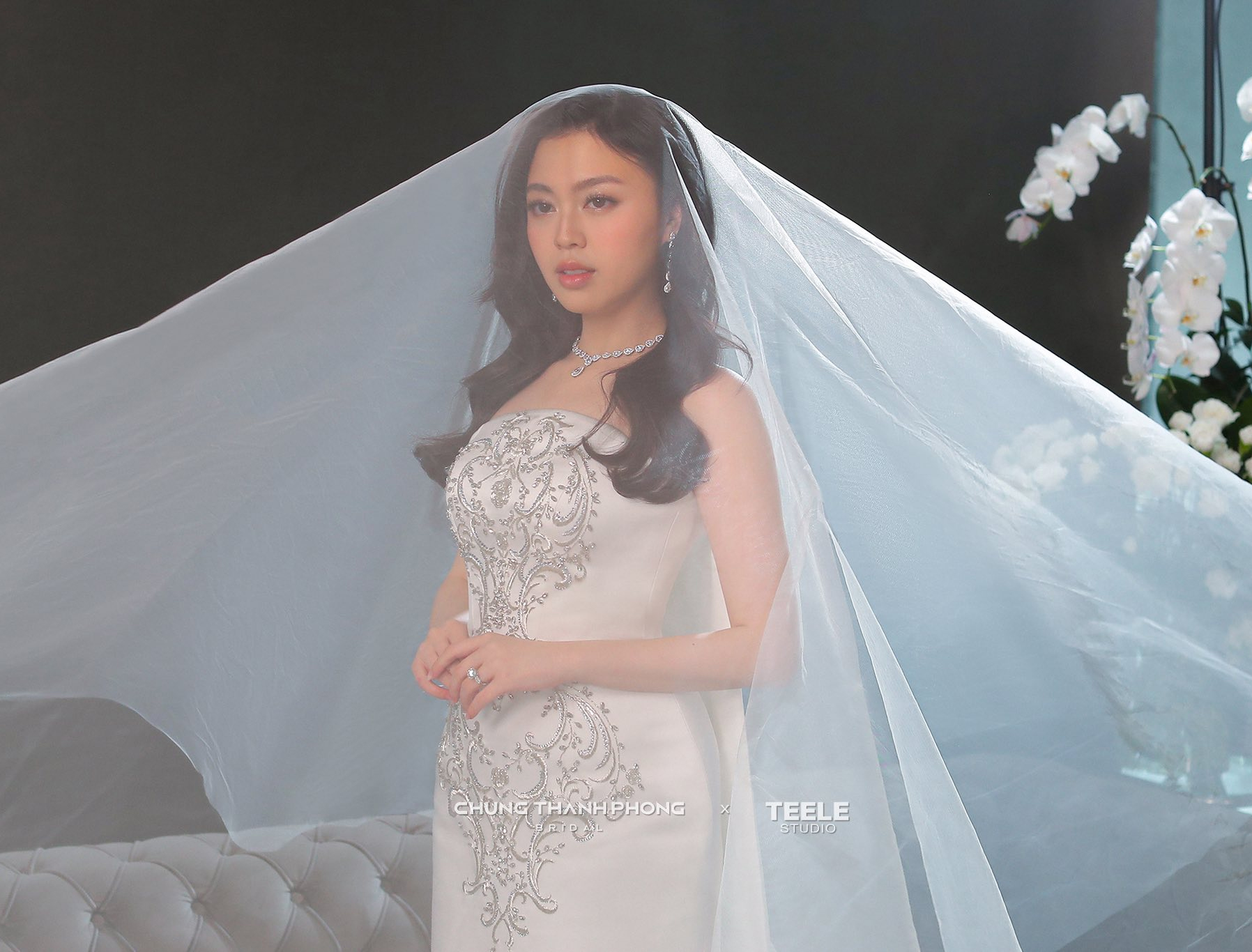 Chung Thanh Phong - nhà thiết kế trang phục cưới cho cô dâu tiết lộ đã tạo ra 6 thiết kế độc bản dành riêng cho ái nữ gia tộc Sơn Kim. Trang phục lấy cảm hứng từ hình ảnh các công nương châu Âu kết hợp cùng những giá trị vốn có của phụ nữ Á đông – nơi vẻ đẹp được tôn vinh bởi sự đoan trang, dịu dàng cùng những phẩm chất cao quý.