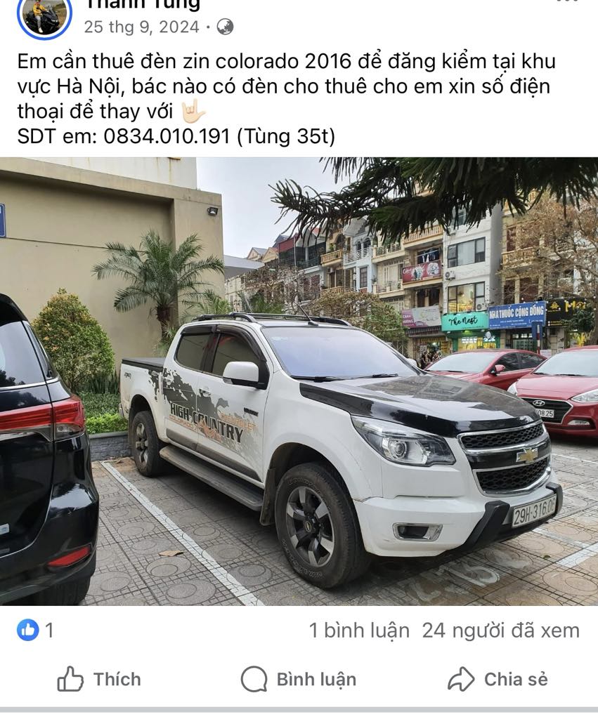 Tương tự, tài khoản “Đình Phong” cũng công khai cho thuê đèn xe với lời quảng cáo: “Các cụ cứ độ đèn thoải mái, không lo đăng kiểm.” Khi đóng vai khách hàng cần thuê đèn cho xe bán tải Ford Ranger 2020, chúng tôi được hướng dẫn đưa xe đến một cơ sở tại Quang Trung, Hà Đông để tháo lắp, đảm bảo đủ điều kiện kiểm định với giá “hữu nghị”.