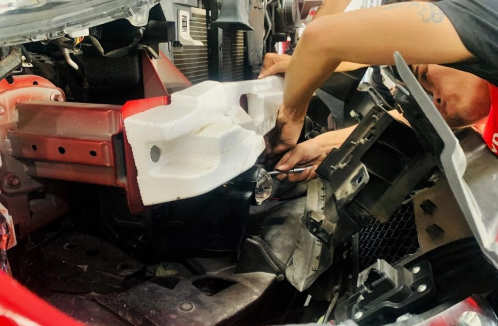 Một người thợ đang lắp phụ tùng zin cho khách để đi đăng kiểm.