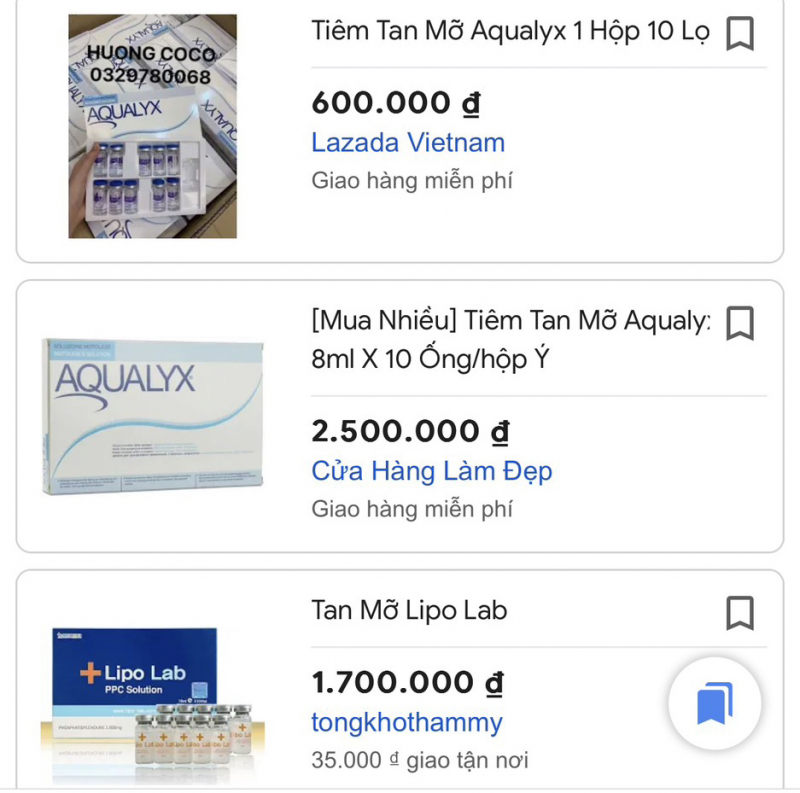 Bên cạnh việc quảng cáo phương pháp tiêm tan mỡ rầm rộ thì các loại thuốc tiêm tan mỡ cũng được bán tràn lan trên mạng xã hội và các sàn thương mại điện tử với đủ nguồn gốc xuất xứ khác nhau. Giá cả đủ loại từ vài trăm nghìn đến cả chục triệu đồng một hộp.