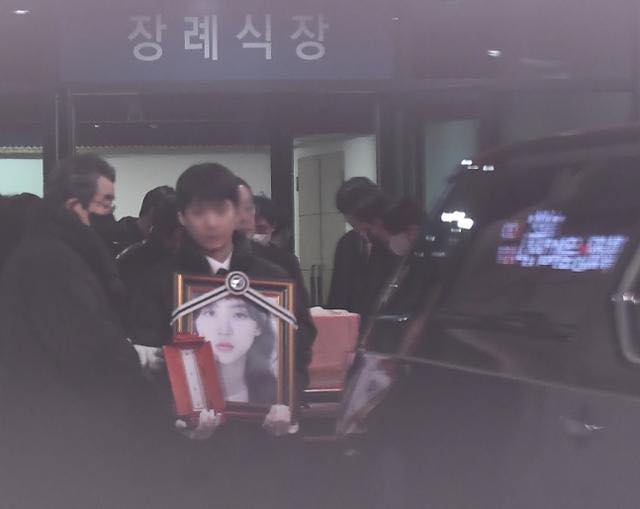 Buổi đưa tiễn được tổ chức riêng tư theo nguyện vọng của gia đình. Nữ diễn viên Kim Bo Ra, ca sĩ Park Woo Jin và một vài đồng nghiệp khác trong showbiz đã có mặt từ sớm tại tang lễ.