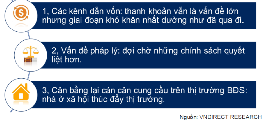 VNDirect cho rằng thị trường BĐS sẽ tiếp tục trầm lắng trong một năm tới, và sự phục hồi sẽ dần rõ nét từ nửa cuối 2024 khi các nút thắt dần được tháo gỡ. Nhà đầu tư nên tập trung vào những DN uy tín thể hiện được những thế mạnh: quỹ đất lớn, đã hoàn thiện các thủ tục pháp lý và cơ sở hạ tầng và sẵn sàng ra chào bán trong giai đoạn 2023-2025, sản phẩm phát triển hướng đến phân khúc bình dân và tầm trung và khả năng tăng trưởng lợi nhuận và mở rộng phạm vi hoạt động tốt với sức khỏe tài chính lành mạnh (bao gồm đòn bẩy thấp, thanh khoản cao) để có năng lực tốt vượt qua giai đoạn khó khăn của thị trường.