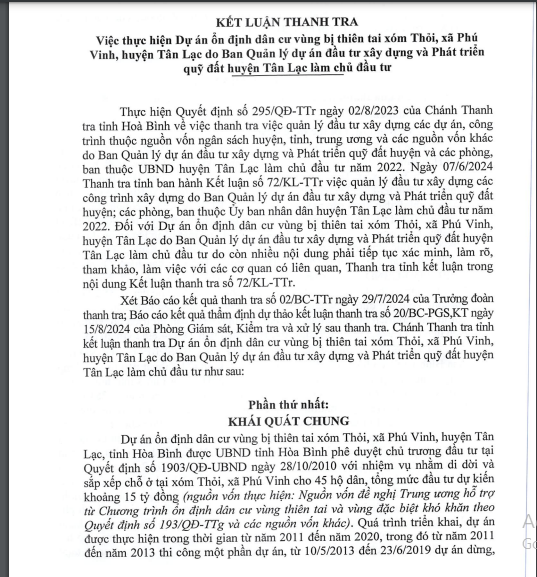 Kết luận số 75/KL-TTr ngày 20/8/2024 về việc thực hiện Dự án ổn định dân cư vùng bị thiên tai xóm Thỏi, xã Phú Vinh, huyện Tân Lạc do Ban Quản lý dự án đầu tư xây dựng và Phát triển quỹ đất huyện Tân Lạc làm chủ đầu tư