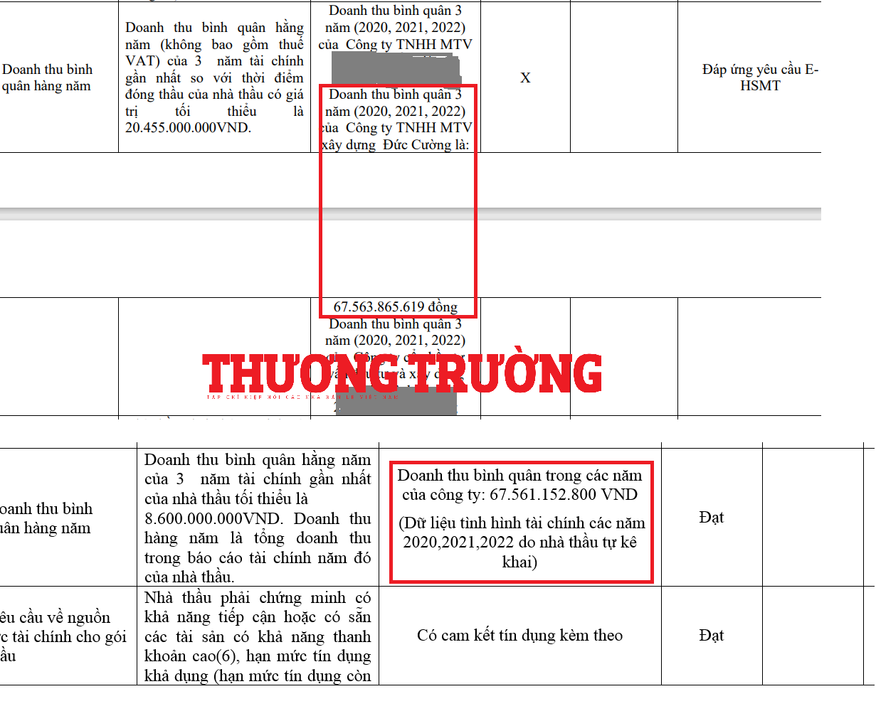 Cụ thể, như đã nói ở trên, ngày 20/12/2023, Công ty Đức Cường trúng Gói thầu: Thi công xây dựng công trình: Xây dựng trường mầm non xã Cuối Hạ, huyện Kim Bôi do Ban QLDA xây dựng huyện Kim Bôi làm chủ đầu tư. Tham dự gói thầu này, Công ty Đức Cường kê khai tài sản ròng trong năm 2022 là 20.000.351.858 VNĐ, Doanh thu bình quân hàng năm của doanh nghiệp 3 năm gần nhất là 67.563.865.619 VNĐ.
