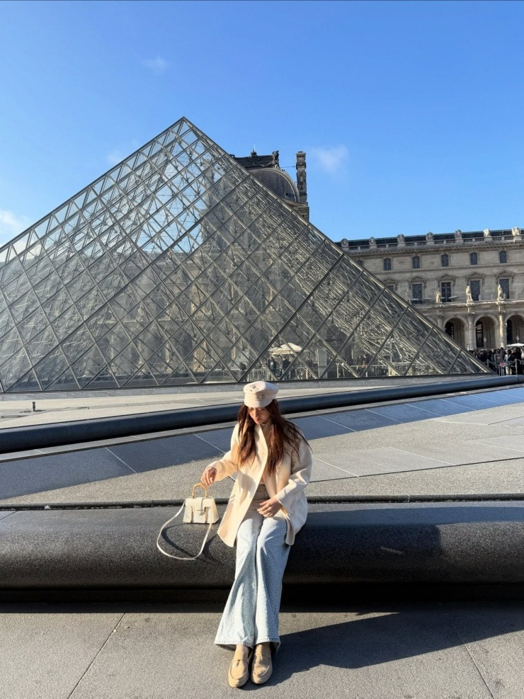 Tạo dáng bên bảo tàng Louvre nổi tiếng Paris, hoa hậu diện set đồ ấm áp, thanh lịch. Cô sử dụng đôi loafer thuộc giới thượng lưu "Summer Walk" của Loro Piana để thuận tiện cho việc đi lại.