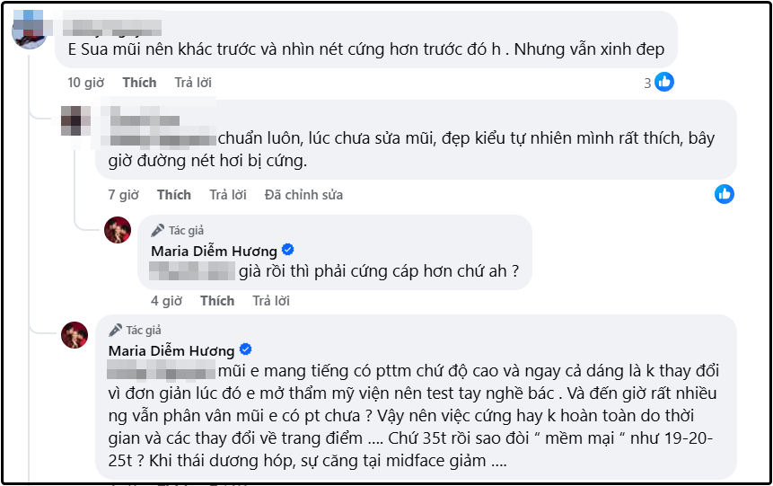 Tuy nhiên ngay phía dưới phần bình luận, một cư dân mạng cho rằng Diễm Hương sửa mũi nên nhìn có phần thay đổi so với quá khứ, đường nét gương mặt cứng hơn trước.