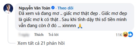 Dưới phần chia sẻ của Hòa Minzy, Văn Toàn sau đó cũng vào bình luận: “Sao cảm giác xem video xong thấy cứ bâng khuâng, buồn buồn, hụt hẫng như mất một thứ gì đó. Chắc chỉ tôi mới cảm nhận được đây là một câu chuyện buồn”.