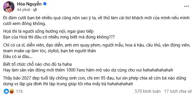 Chia sẻ của nữ ca sĩ lập tức hút 17 nghìn lượt thích và hàng trăm lượt bình luận gây xôn xao. Theo đó, người đẹp lên kế hoạch về đám cưới của bản thân nếu tổ chức dự định sẽ làm ở sân vận động vì quá nhiều bạn bè, khách mời... để đi ăn đám cưới. Ngoài ra, người đẹp còn tiết lộ năm 2027 sẽ là năm hợp tuổi của các chị em sinh năm 1995.
