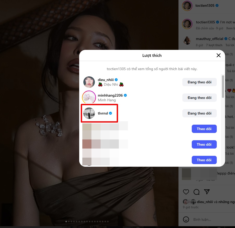 Hoàng Touliver liên tục "thả tim" ảnh của Tóc Tiên trên Instagram.
