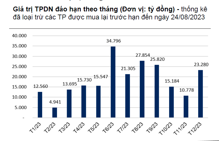 Trong 4 tháng cuối năm 2023, VBMA ước tính sẽ có khoảng 103.022 tỷ đồng trái phiếu đáo hạn. VNDirect cho rằng áp lực TPDN riêng lẻ đáo hạn trong tháng 9 vẫn lớn, trong khi doanh sách các doanh nghiệp chậm thanh toán theo công bố của HNX vẫn tăng lên.