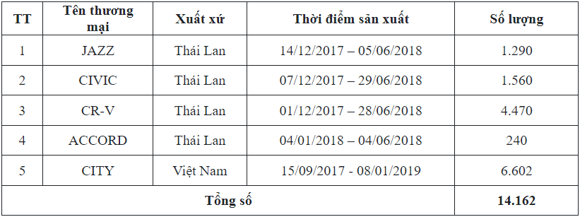 Theo đó, có 1.290 xe Honda Jazz sản xuất từ ngày 14/12/2017 đến ngày 5/6/2018; 1.560 xe Honda Civic sản xuất từ ngày 7/12/2017 đến ngày 29/6/2018; 4.470 xe Honda CR-V sản xuất từ ngày 1/12/2017 đến ngày 28/6/2018; 240 xe Honda Accord sản xuất từ ngày 4/1/2018 đến ngày 4/6/2018. Đây đều là các xe được nhập khẩu nguyên chiếc từ Thái Lan về phân phối.