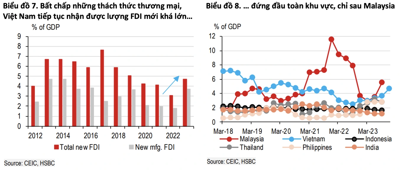 Các chuyên gia HSBC dự báo Việt Nam đang phục hồi theo đúng tiến độ, có khả năng lấy lại mức tăng trưởng xu hướng 6% trong năm 2024. Khi các dòng vốn FDI tiếp tục gia tăng năng lực sản xuất, lĩnh vực sản xuất của Việt Nam sẽ có dấu hiệu phục hồi, mang lại cơ hội cho lĩnh vực xuất khẩu. Mặc dù cần theo dõi diễn biến tác động của việc áp dụng thuế doanh nghiệp tối thiểu 15%, những tác động này vẫn nằm trong tầm kiểm soát.