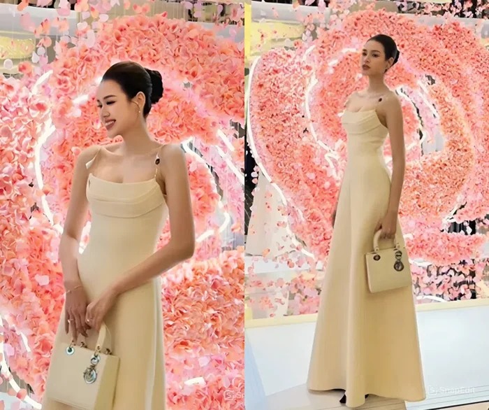 Hoa hậu Đỗ Thị Hà ngày càng ra dáng dâu hào môn sang chảnh mà vẫn lịch thiệp. Người đẹp lựa chọn đầm hai dây màu kem khoe vòng 1 căng tràn sức sống phối cùng túi Dior đồng điệu. Đặc biệt, hai chiếc nhẫn kim cương siêu to khổng lồ trên tay giúp mỹ nhân nâng tầm diện mạo.