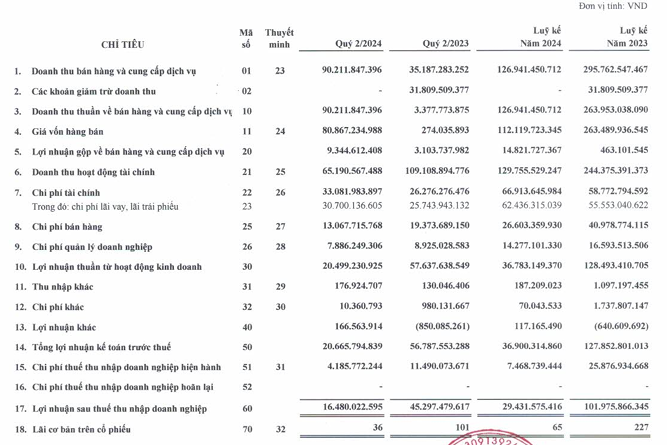 Lũy kế 6 tháng, doanh thu thuần KHG gần 127 tỷ đồng và lãi ròng hơn 29 tỷ đồng, lần lượt giảm 52% và 71% so với cùng kỳ.