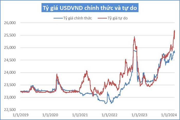 Tỷ giá VND tự do hiện đã lên tới 25.600 VND/USD, tăng 3,4% so với đầu năm. Trước đó, trong cả năm 2023, tỷ giá tự do cũng đã tăng 4,2%. Mà lý do chính làm tăng tỷ giá bắt nguồn từ lãi suất. Lãi suất VND đang rất thấp, thậm chí còn thấp hơn thời điểm COVID-19 năm 2020, 2021. Lãi suất liên ngân hàng  USD - VND thì đã ở trạng thái dương kể từ đầu năm 2023.