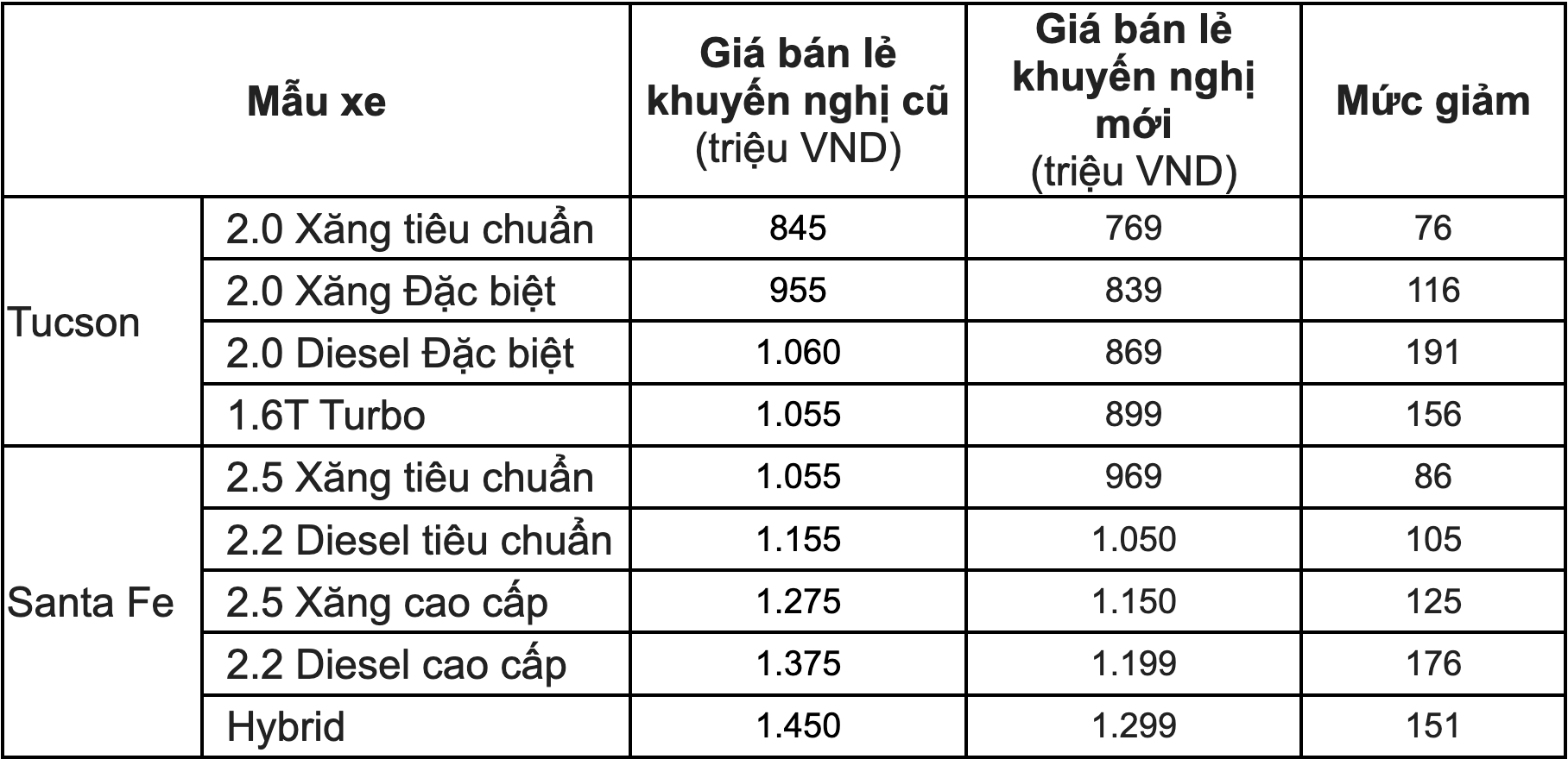 Cũng theo chủ trương chung của chính phủ trong chiến lược phát triển công nghiệp ô tô, hỗ trợ người tiêu dùng sớm có được sản phẩm ô tô chất lượng cao, nhiều tính năng hiện đại, phục vụ nhu cầu di chuyển đi lại cũng như phát triển kinh tế, Hyundai Thành Công Việt Nam chính thức công bố giá bán lẻ khuyến nghị mới cho 2 sản phẩm SUV được ưa chuộng hàng đầu là Hyundai Tucson và Santa Fe với giá bán lẻ cụ thể như sau (đã bao gồm thuế VAT):