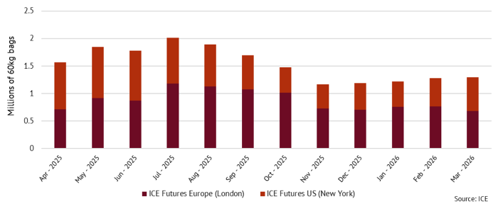 Tồn kho cà phê trên hai sàn London và New York tính đến cuối tháng 3/2026. (Nguồn: ICO)