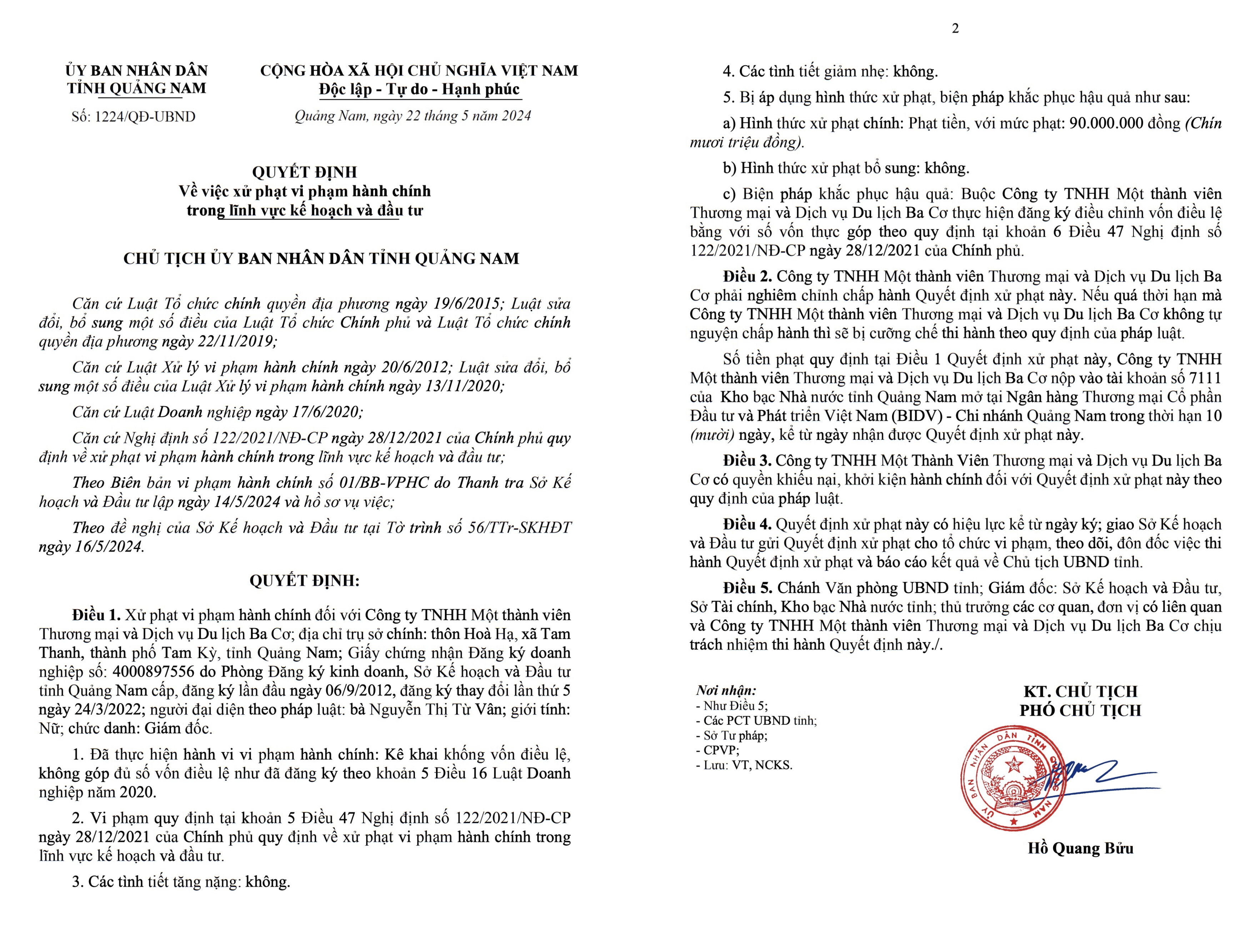 Ngày 22/5, ông Hồ Quang Bửu, Phó chủ tịch UBND tỉnh Quảng Nam đã ký quyết định số 1224 về việc xử phạt vi phạm hành chính trong lĩnh vực kế hoạch và đầu tư đối với Công ty Dịch vụ Du lịch Ba Cơ.
