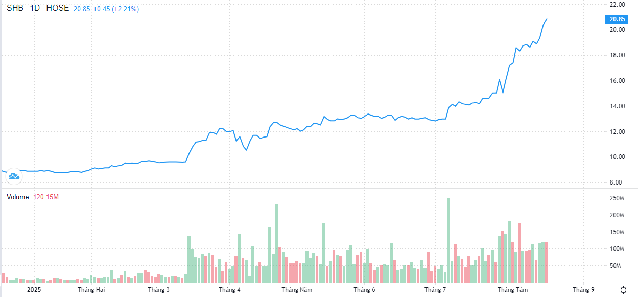 Cuối tuần trước, cổ phiếu SHB kết thúc phiên 15/8 với thanh khoản dẫn đầu thị trường đạt 120 triệu đơn vị và bất chấp thị trường điều chỉnh, thị giá cổ phiếu SHB tăng 2,2%. đóng cửa ở mức 20,850 đồng/cổ phiếu, hơn gấp đôi đầu năm.
