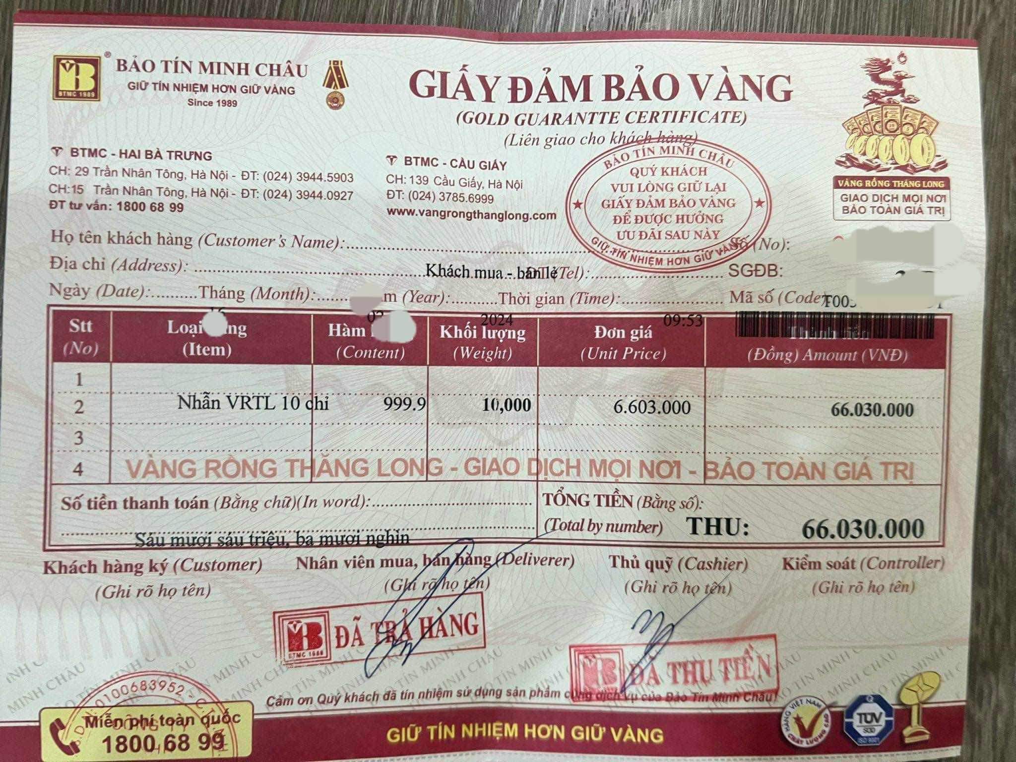 Theo bà L, vào ngày 16/2/2024, bà có mua 10 chỉ vàng nhẫn vàng rồng Thăng Long với giá 6.603.000/chỉ tại Bảo Tín Minh Châu địa chỉ 139 Cầu Giấy. Tuy nhiên khi giao dịch bà T cũng chỉ phải trình thẻ căn cước công dân và số điện thoại. Khi nhận vàng thì phía nhân viên của công ty có đưa cho bà một tờ “Giấy đảm bảo vàng”.
