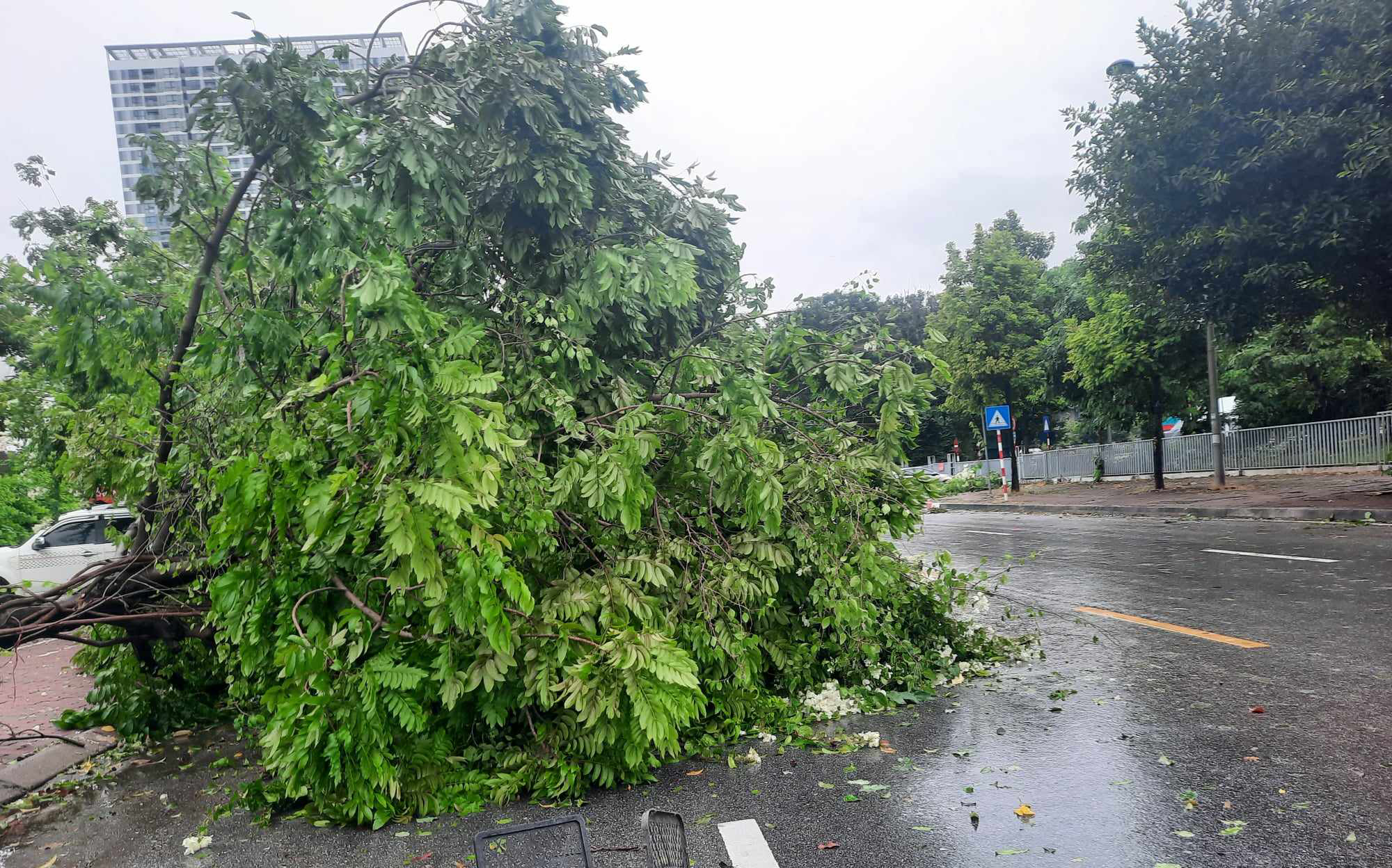 Tại Vinhomes Westpoint trên phố Đỗ Đức Dục, cây xanh cũng gãy đổ chắn ngang đường