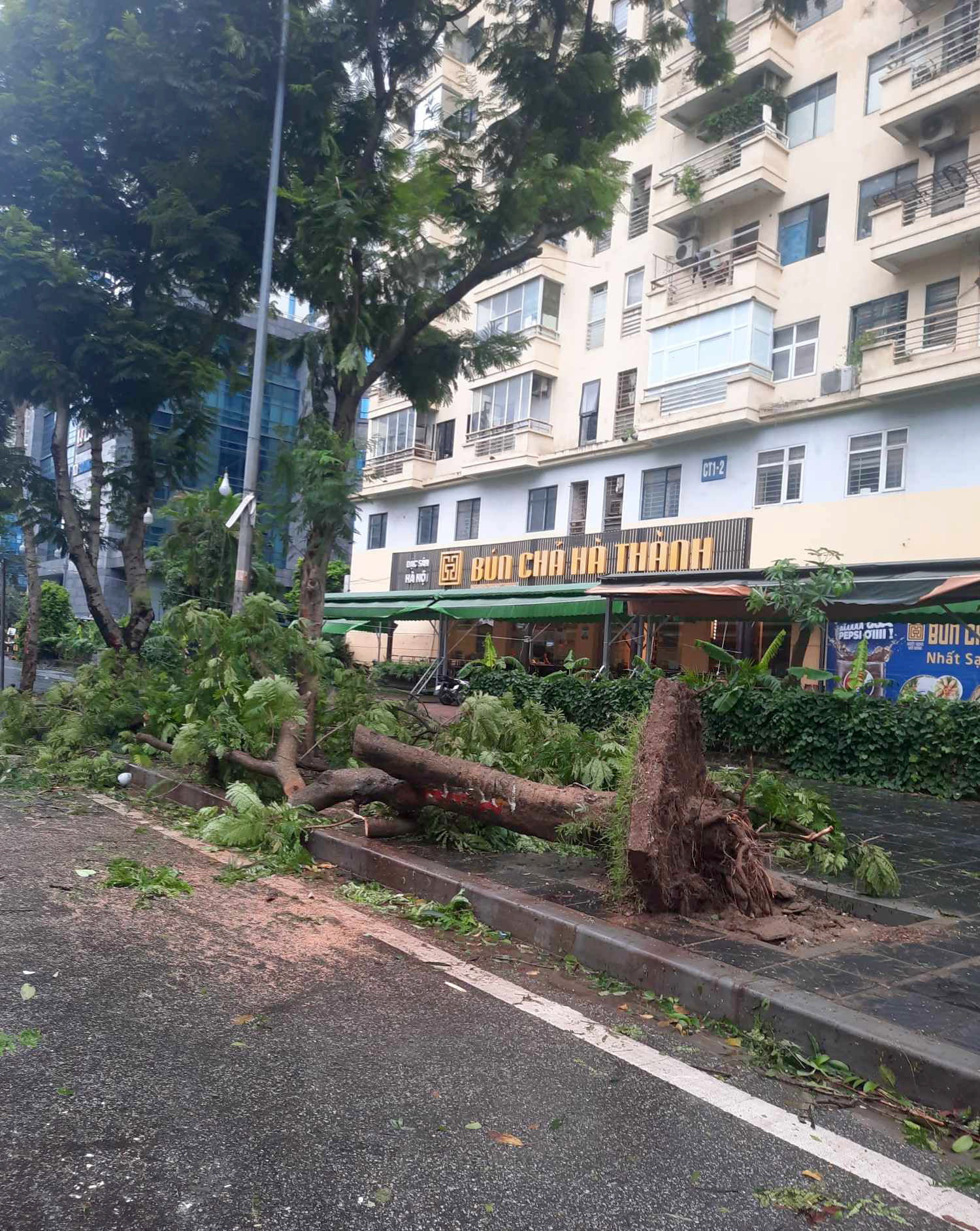 Trên phố Mễ Trì cây xanh cũng gãy đổ rất nhiều. Lực lượng chức năng vẫn đang cố gắng để cắt tỉa và dọn dẹp