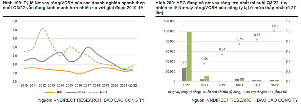VNDirect lưu ý rằng các khoản vay của các công ty thép phần lớn là ngắn hạn nhằm phục vụ tài trợ vốn lưu động. Với nỗ lực giảm giá lượng hàng tồn kho trong quý 4/2022, chúng tôi cho rằng nợ vay ròng của các công ty thép sẽ tục giảm hơn nữa trong các quý tới.