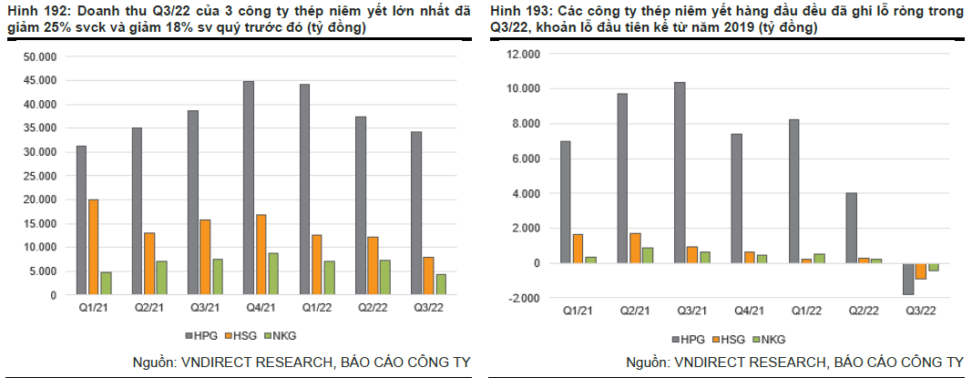 Trong báo cáo ngành mới đây, Công ty chứng khoán VNDirect cho biết, hầu hết các công ty thép đều ghi nhận kết quả kinh doanh ảm đạm trong quý 3/2022. Doanh thu của 3 công ty thép niêm yết lớn nhất (bao gồm HPG, HSG, NKG) đã giảm 25% so với cùng kỳ và 18% so với quý trước đó khi nhu cầu thép yếu khiến cả sản lượng và giá bán đều giảm.