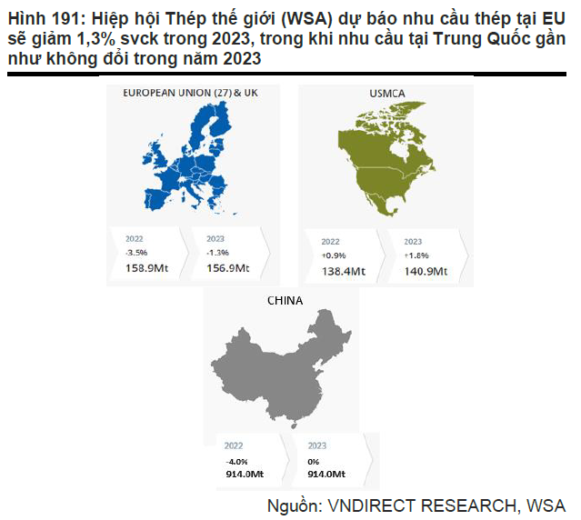 VNDirect cho rằng hoạt động xuất khẩu thép của Việt Nam vẫn sẽ gặp nhiều khó khăn trong những tháng tới, trước khi tình hình được cải thiện trong nửa cuối năm 2023. Kỳ vọng này đến từ việc đẩy mạnh đầu tư cơ sở hạ tầng, các lệnh giãn cách xã hội có dấu hiệu được nới lỏng và các gói cứu trợ lĩnh vực bất động sản dần có hiệu lực ở Trung Quốc và sản xuất công nghiệp toàn cầu phục hồi khi tình trạng thiếu hụt năng lượng dần được kiểm soát.