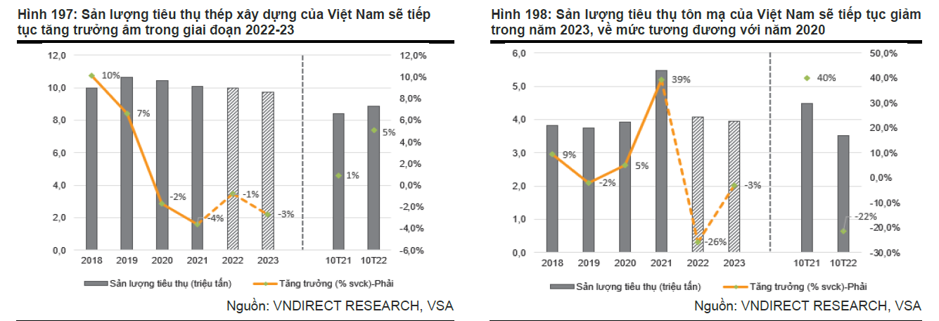 Mặc dù giải ngân đầu tư công được kỳ vọng sẽ tăng tốc trong những quý tới, VND dự báo tổng nhu cầu thép trong nước sẽ tăng trưởng âm một chữ số vào năm 2023. Cụ thể, sản lượng tiêu thụ thép xây dựng và tôn mạ sẽ cùng giảm 3% so với cùng kỳ trong năm 2023.