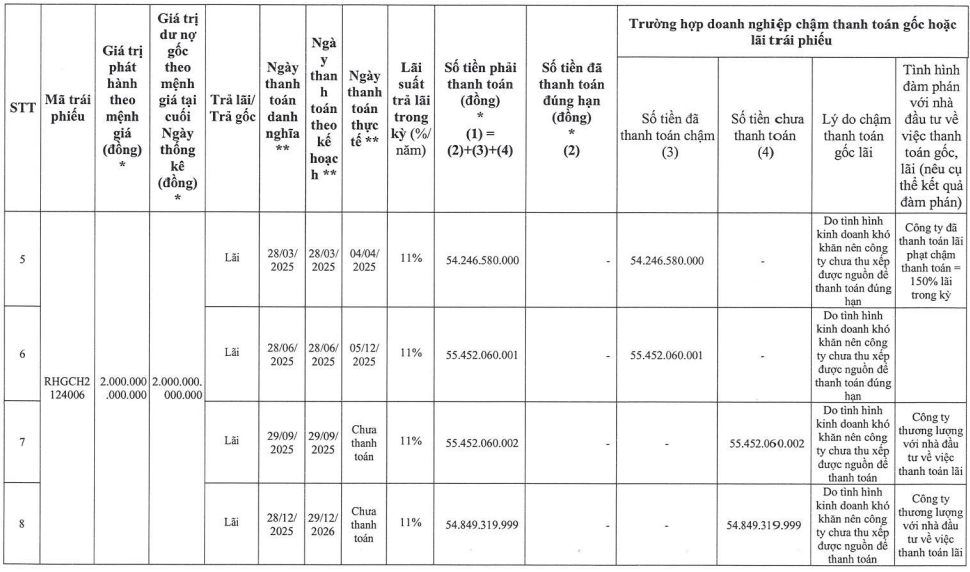 Đối với lô trái phiếu mã RHGCH2124006 có tổng giá trị 2.000 tỷ đồng, doanh nghiệp cũng đã thanh toán chậm hai kỳ lãi với tổng số tiền khoảng 109,7 tỷ đồng, đồng thời chưa thanh toán hai kỳ lãi còn lại trị giá hơn 110,3 tỷ đồng.