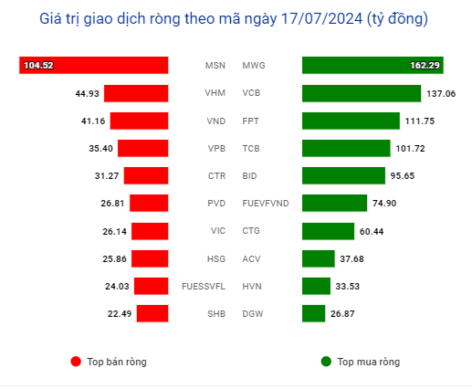 Cụ thể, cổ phiếu MWG của Công ty cổ phần Đầu tư Thế giới Di động dẫn đầu bên mua với giá trị 162,7 tỷ đồng. Theo sau, VCB được mua ròng 136,1 tỷ đồng. Lực cầu còn được ghi nhận ở FPT (111,6 tỷ đồng) và TCB (102,2 tỷ đồng). Danh mục top10 mã được mua ròng nhiều nhất trong phiên còn có sự góp mặt của BID, FUEVFVND, CTG, STB, HVN, DGW, … với giá trị dưới 100 tỷ đồng.