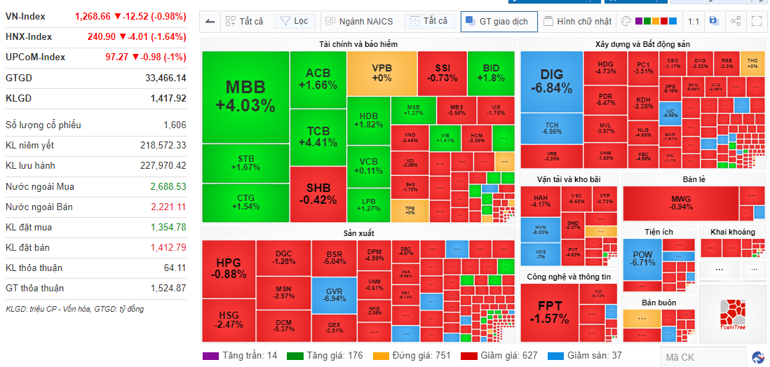 Cuối phiên, sàn HoSE có 109 cổ phiếu tăng giá, so với 369 mã giảm giá. Dòng tiền của nhà đầu tư tập trung vào ba nhóm ngành chính là ngân hàng, bất động sản và dịch vụ tài chính.