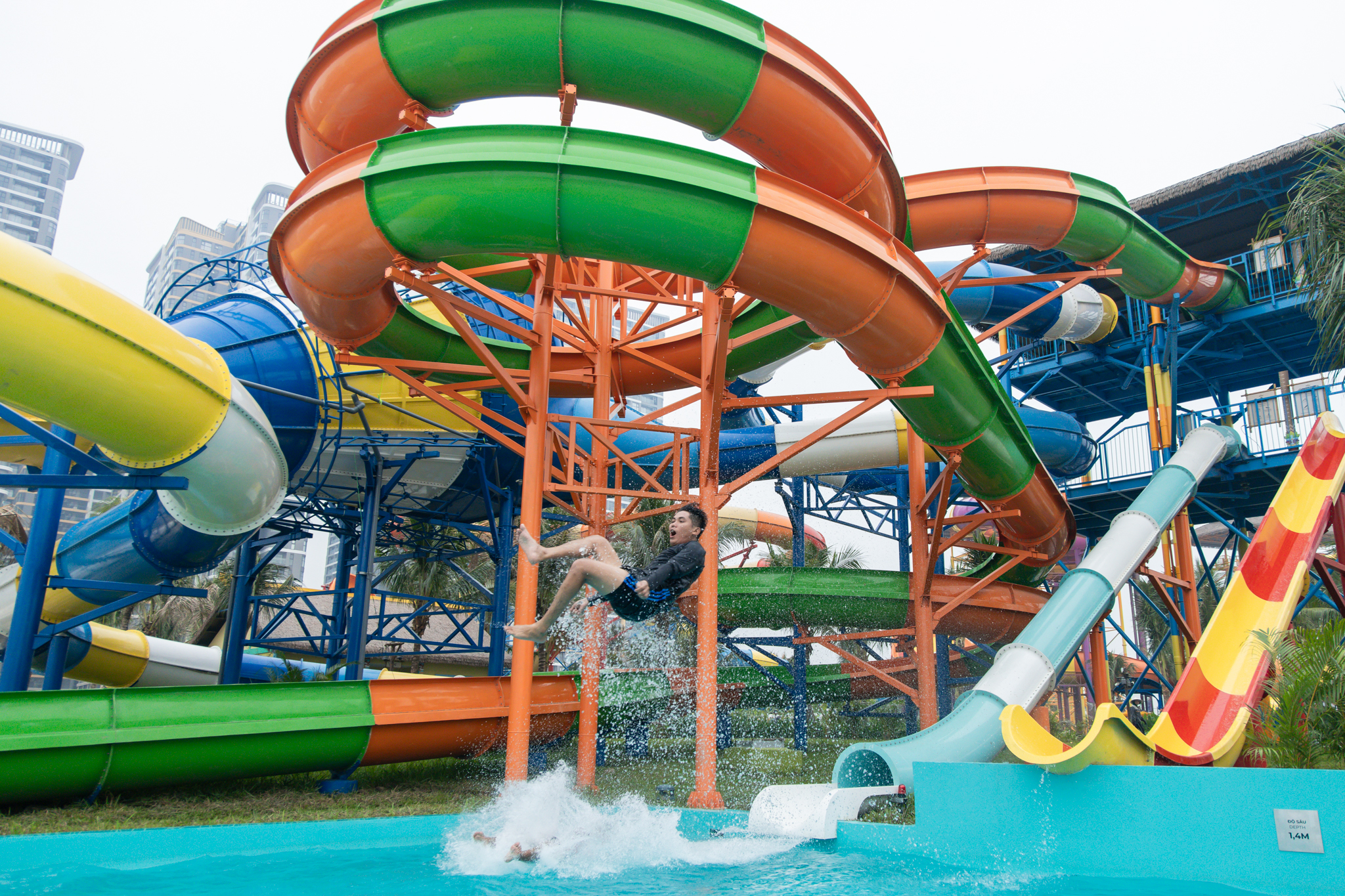 Ngay từ sáng, khu vực công viên nước “Hòn đảo Nhiệt đới” đã nhộn nhịp du khách đến vui chơi. Nếu những bạn trẻ thích trải nghiệm các trò cảm giác mạnh đầy thách thức như “Cú rơi siêu tốc” từ độ cao 13m, đường trượt xoắn khổng lồ “Thần long cuộn sóng” dài 119m, “Thủy quái đại dương” từ độ cao hơn 20m…; thì các du khách nhí được dịp vùng vẫy thỏa thích tại “Vịnh sóng thần” và cụm 9 đường trượt đa dạng của “Ốc đảo diệu kỳ”.