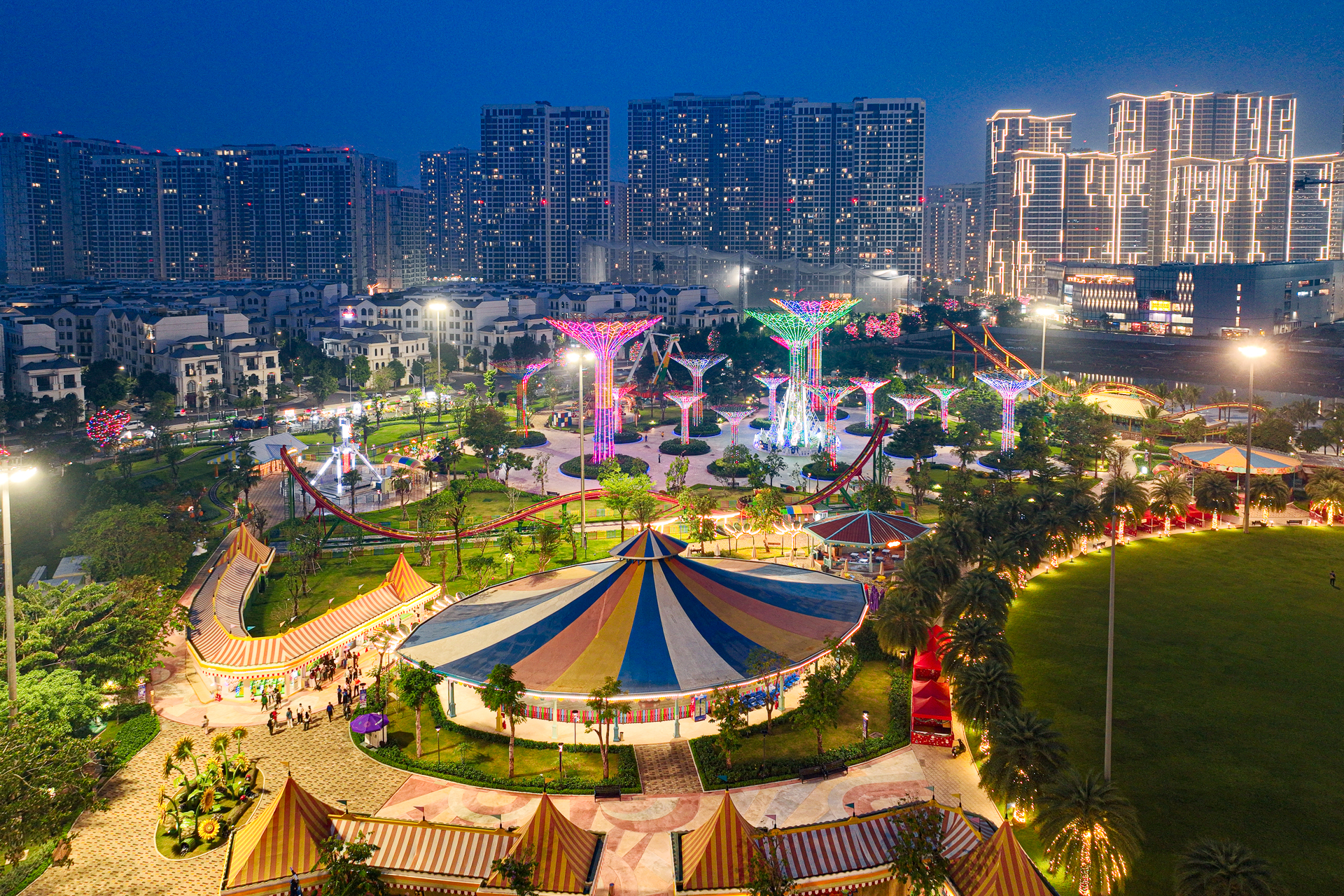 Trong khi đó, bao trùm khắp “vũ trụ giải trí” là không khí lễ hội tưng bừng, náo nhiệt chưa từng có. Tại đại công viên hàng ngàn người hào hứng tham gia các hoạt động hoạt náo. Trên các tuyến đường, đoàn xe buggy rực rỡ diễu hành khắp mang niềm vui rộn ràng lan tỏa khắp đại đô thị. Trong giai điệu Giáng sinh tưng bừng, các ông già Noel, công chúa tuyết và hàng chục nhân vật cổ tích liên tục vẫy chào và tương tác cùng du khách.