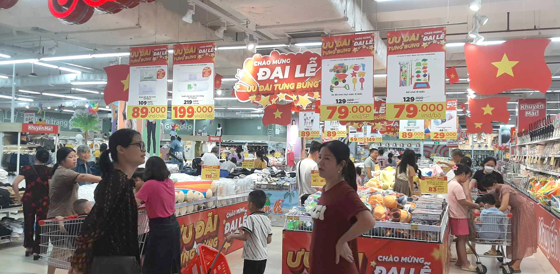Ngoài các loại thực phẩm thiết yếu, sức mua mặt hàng thời trang như quần áo, hàng hoá tiêu dùng khác cũng tăng so với giai đoạn trước lễ. Bên cạnh cải tiến mẫu mã, nâng cao chất lượng của doanh nghiệp, các siêu thị và cửa hàng triển khai nhiều chương trình khuyến mãi kích cầu giảm giá, hoặc tặng voucher, quà tặng cho đơn hàng đạt mức giá trị tối thiểu để kích cầu tiêu dùng. Tại Go! Vinh, siêu thị này có tung chương trình khuyến mãi hấp dẫn với chủ đề “chào mừng Đại lễ, ưu đãi tưng bừng”. Theo đó, phần lớn các mặt hàng có tại cơ sở này đều được giảm giá, do đó đã thu hút đông đảo người dân về đây mua sắm.