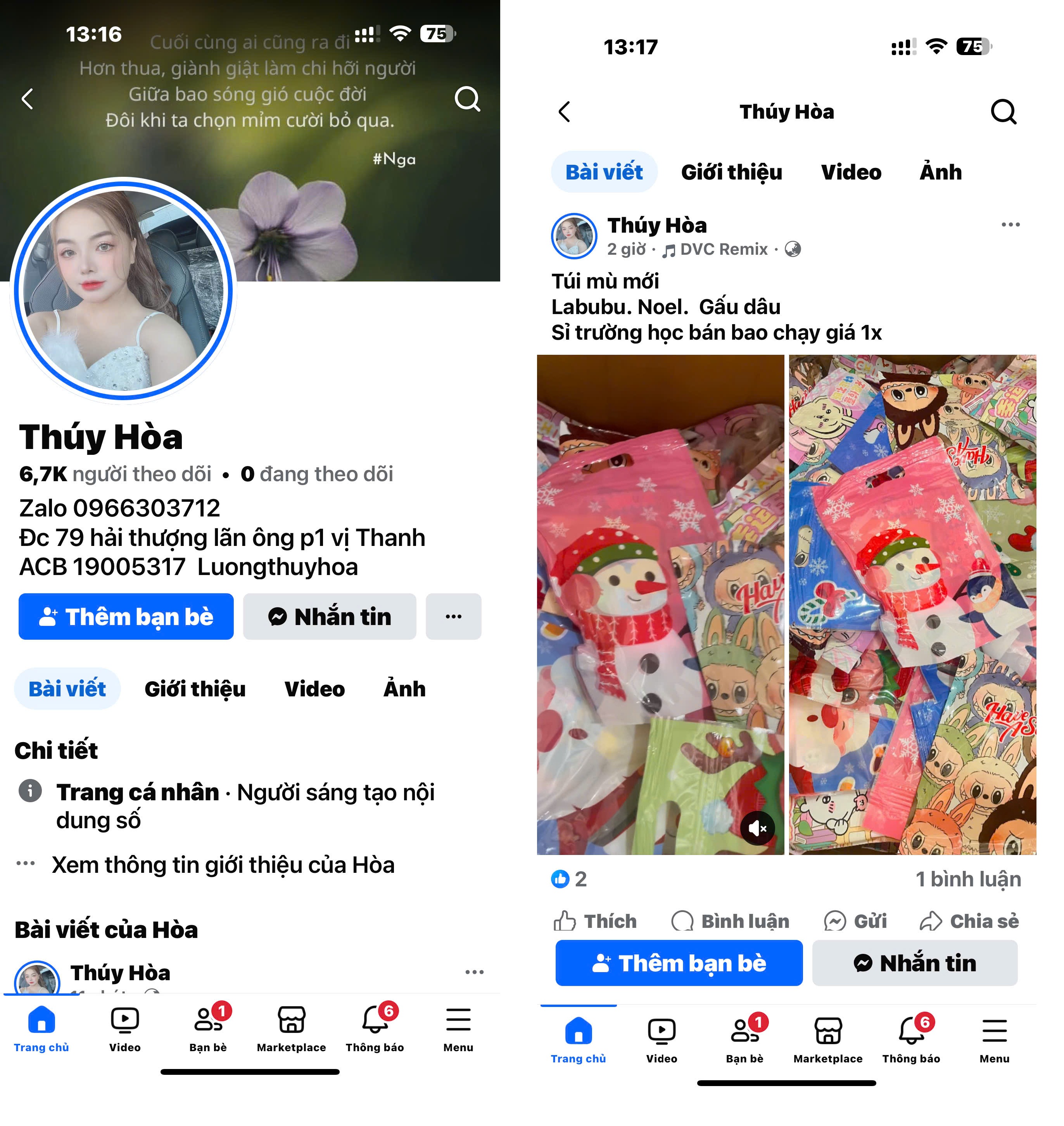 Tiếp tục thực hiện Kế hoạch công tác về thương mại điện tử của Cục QLTT tỉnh Hậu Giang, Đội QLTT số 1 tăng cường giám sát hoạt động kinh doanh trên nền tảng thương mại điện tử. Qua giám sát, Đội đã phát hiện Hộ kinh doanh T.H sử dụng tài khoản Facebook "THÚY HÒA" giới thiệu, đăng bán các sản phẩm “Túi mù”.