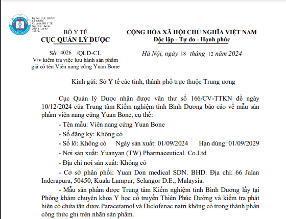 Cục Quản lý Dược cho biết đã nhận được văn thư của Trung tâm Kiểm nghiệm tỉnh Bình Dương báo cáo về mẫu sản phẩm viên nang cứng Yuan Bone không có số đăng ký, số lô; Ngày sản xuất: 01/09/2024, hạn dùng: 01/09/2029; địa chỉ nơi sản xuất không có.